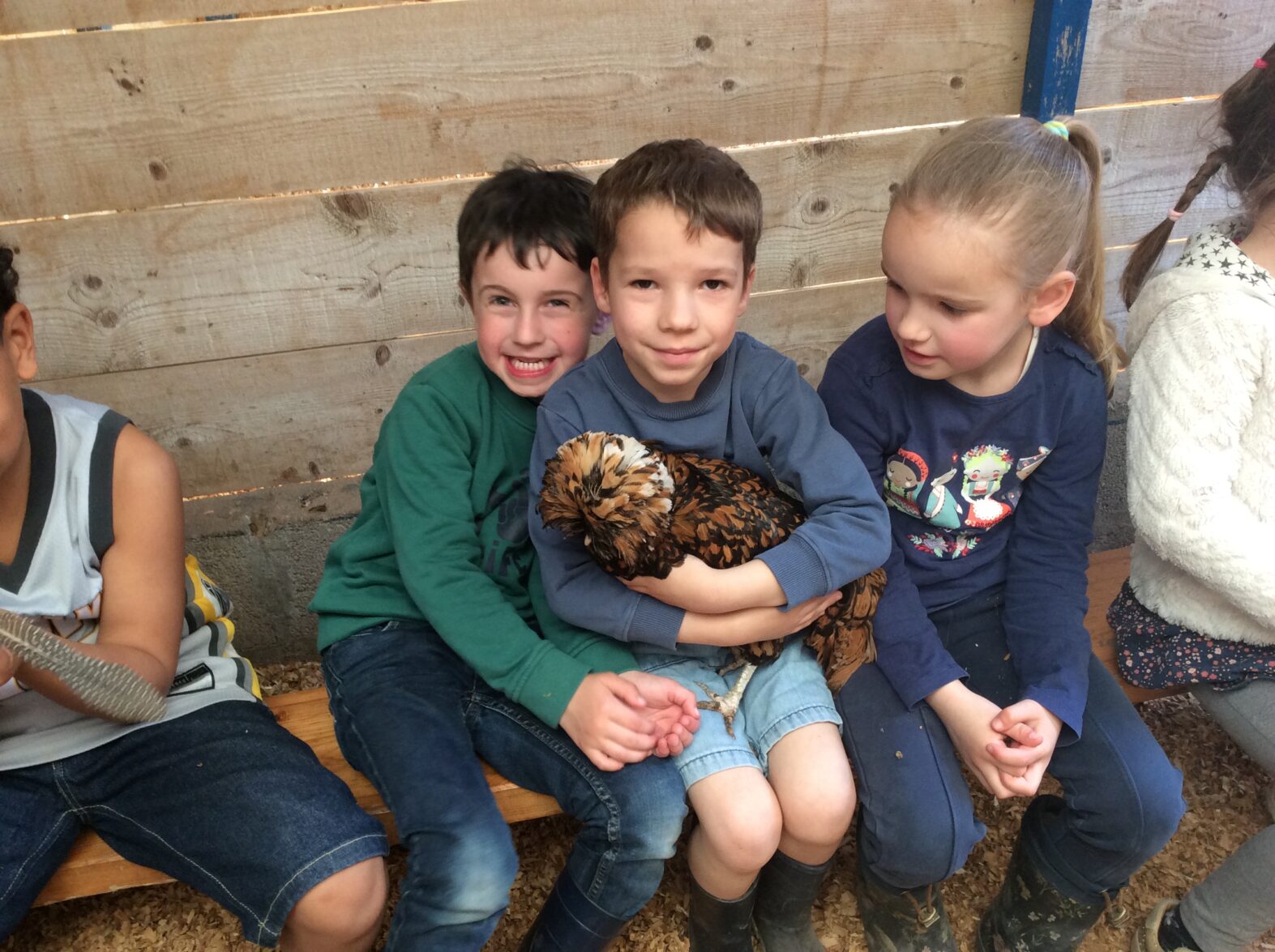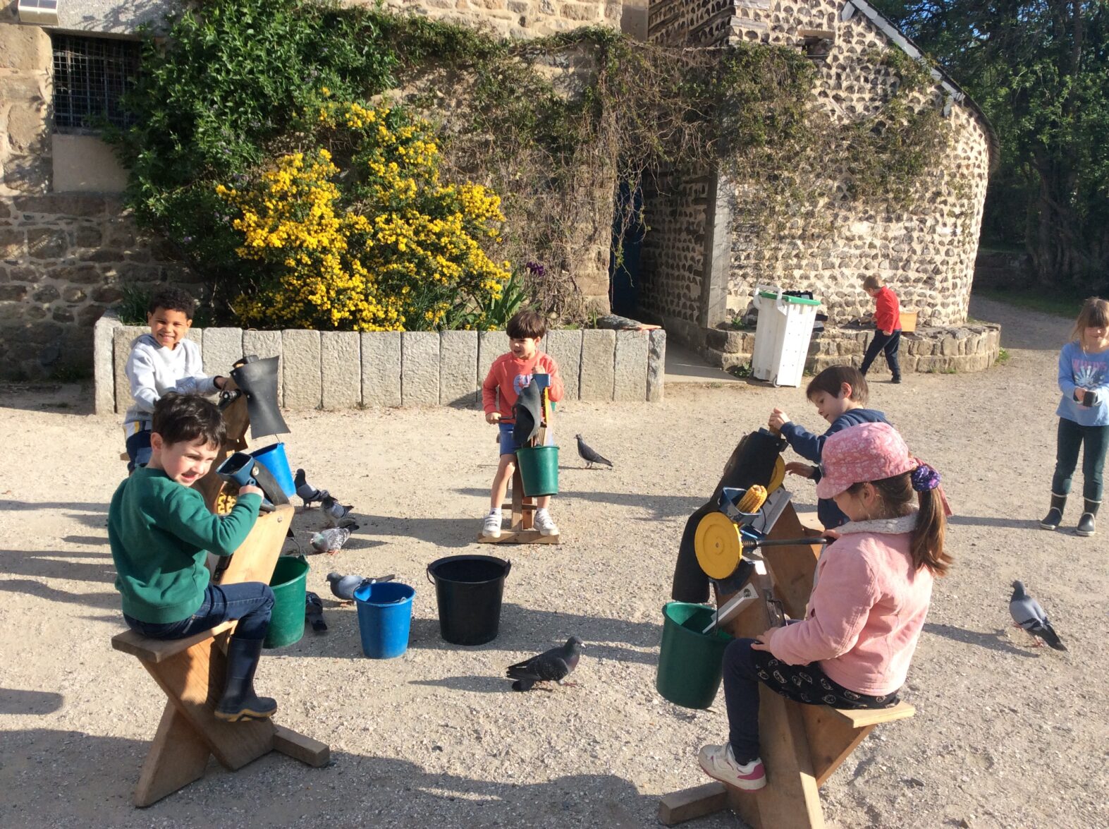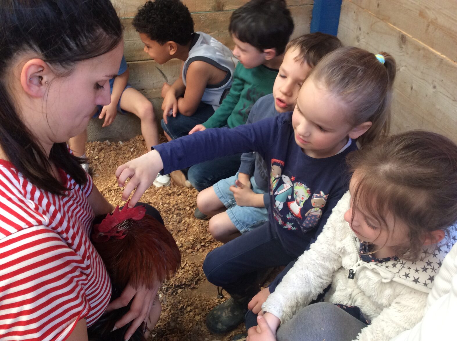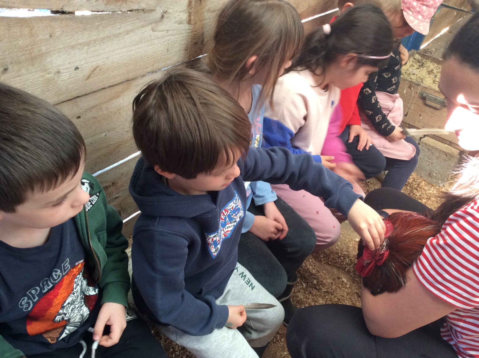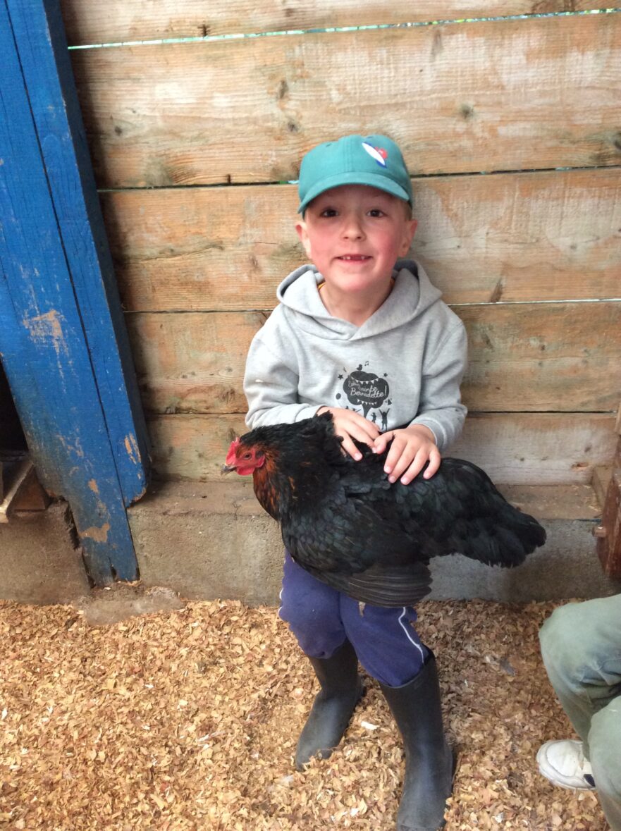 Mardi 7 avril les élèves de grande section se sont rendus à la ferme de la Ville Oger afin de de participer à un atelier sur le thème de la basse-cour. Au programme : connaissances générales sur les ovipares, cycle de reproduction, nourrissage (nous avons égrainé des épis de maïs, rajouté du pain rassis, de la farine de blé que nous avons moulue puis distribué tout ça dans la basse-cour aux oies, poules, canards, dindons et pintades). reconnaissance des différents œufs des volailles de la basse-cour…. Ce travail se poursuivra à la rentrée puisque nous aurons la chance d’avoir une couveuse en classe.